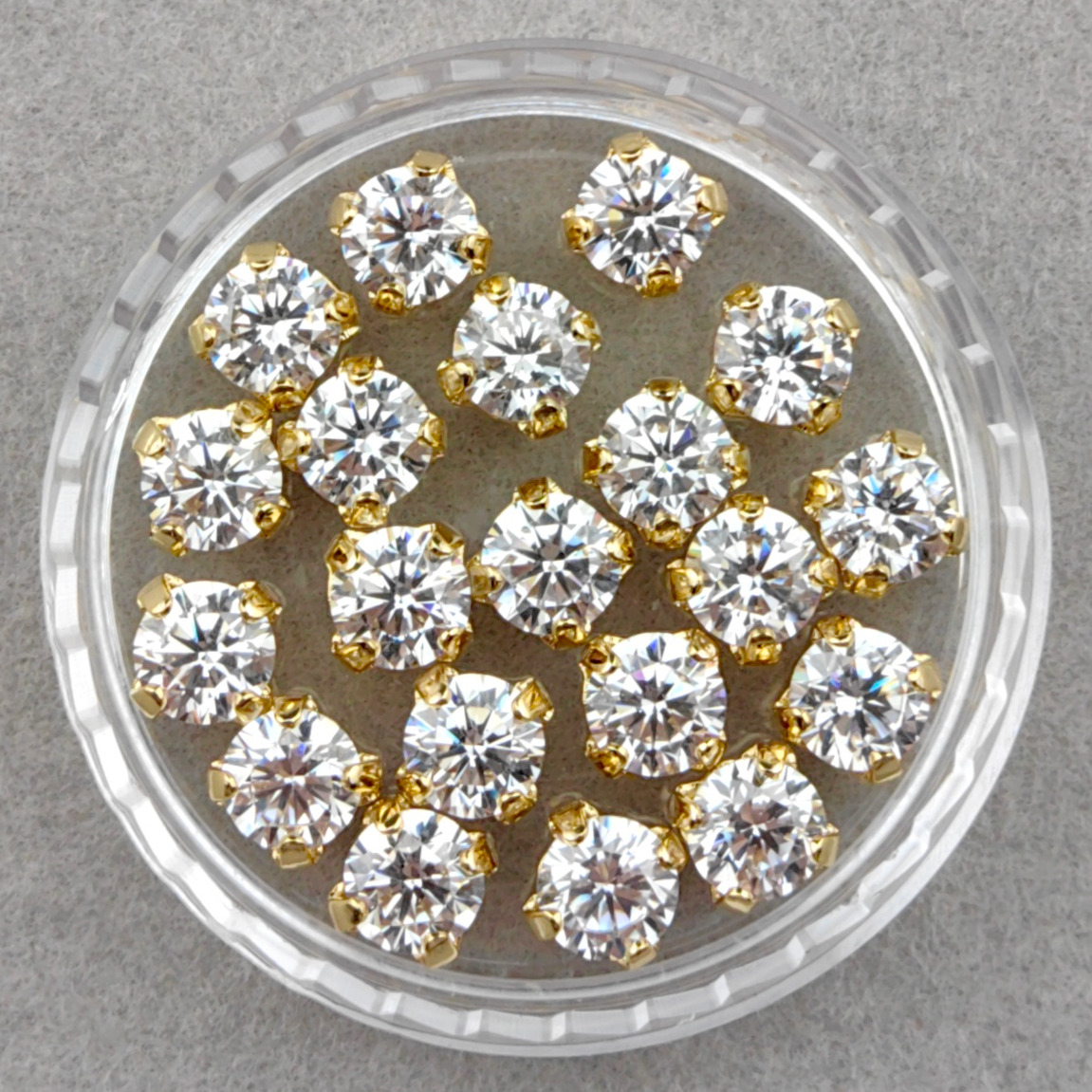 Фианиты круглые в оправах с позолоченным (14k) покрытием.