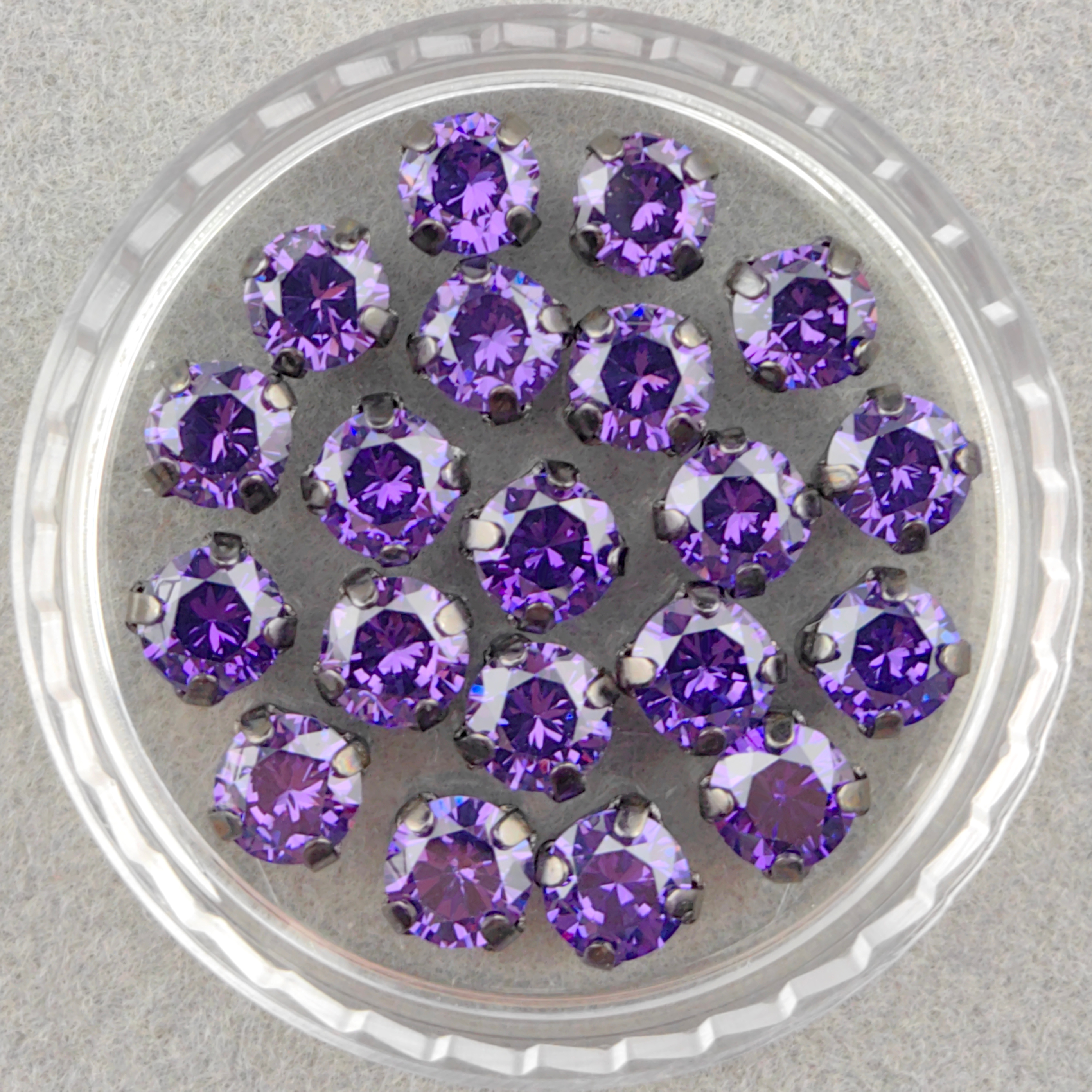 Фианиты круглые, фиолетовые в оправах цвета темной стали (Violet/Gunmetal).