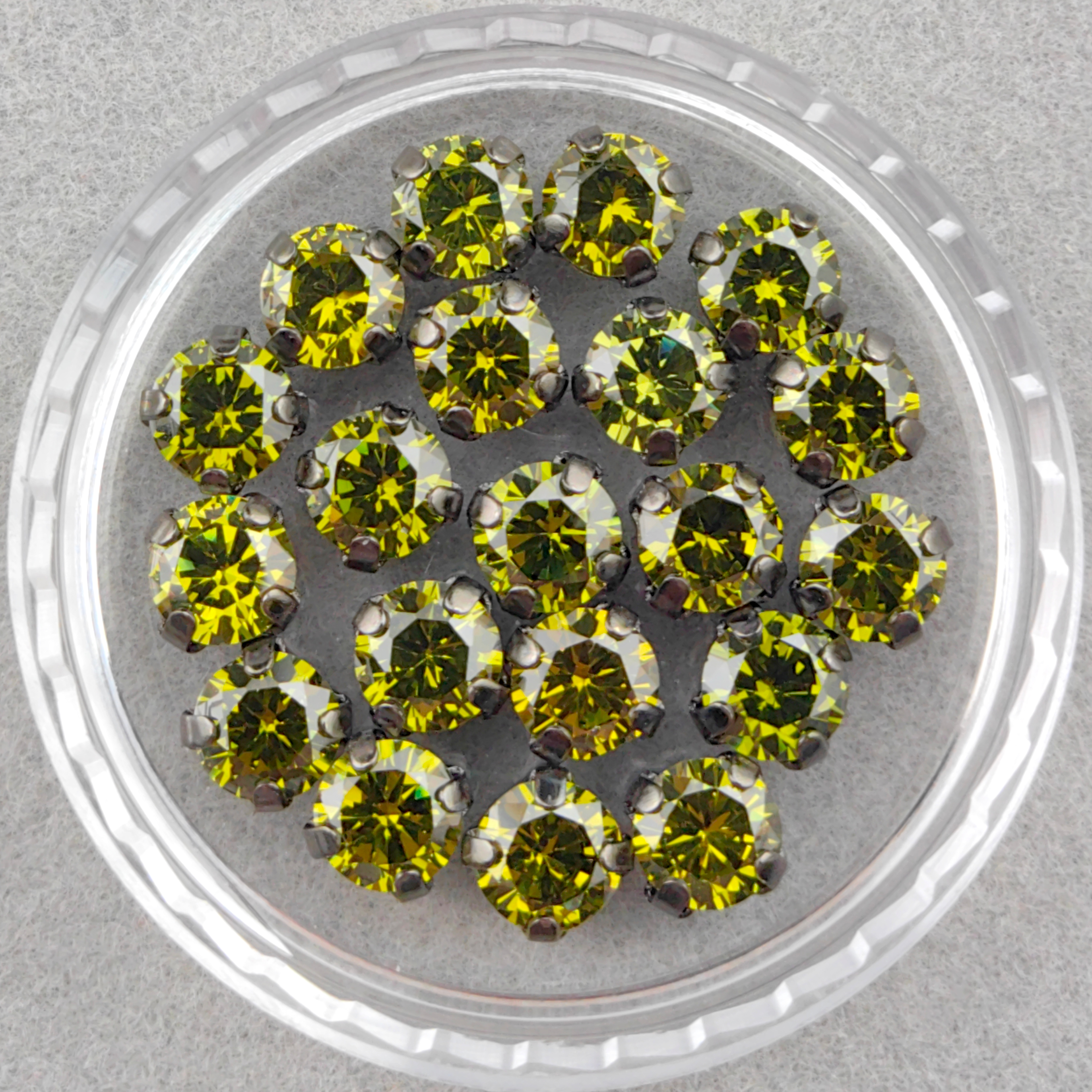 Фианиты круглые, хризолитовые в оправах цвета темной стали (Olive Green/Gunmetal).