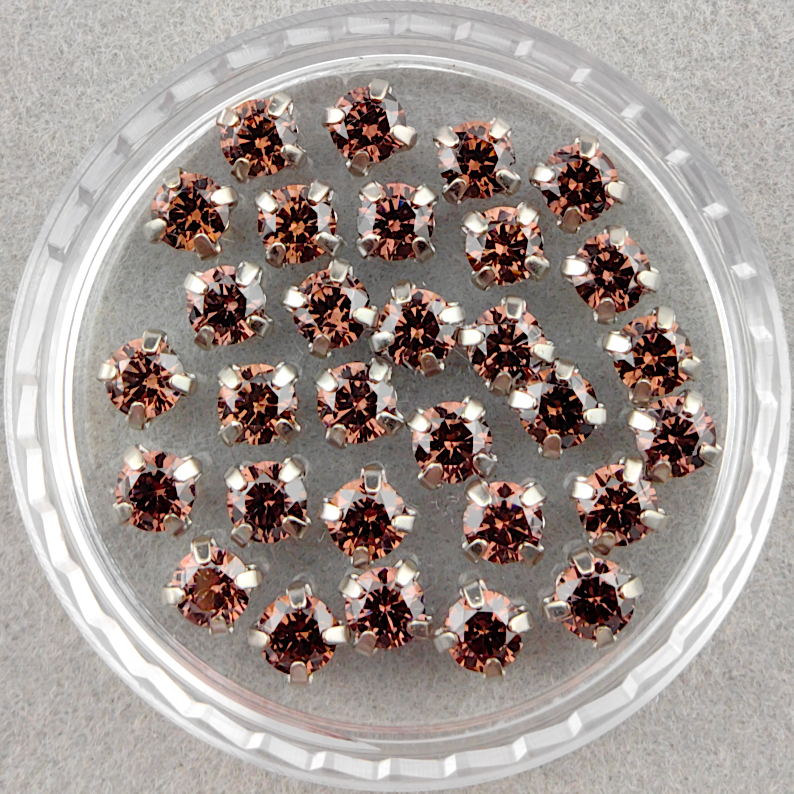 Фианиты круглые, кофейные в оправах платинового цвета (Coffee/Platinum).