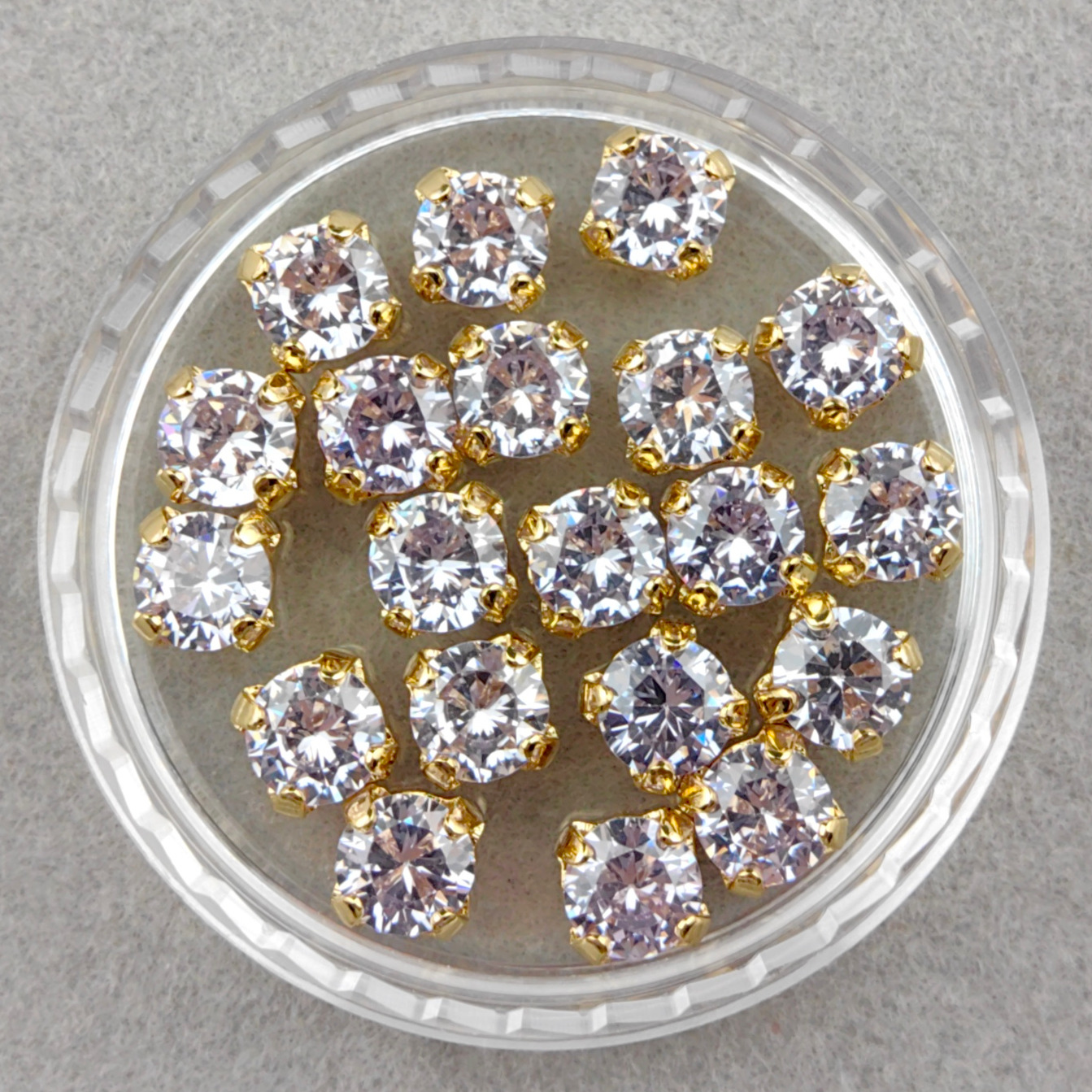 Фианиты круглые в оправах с позолоченным (14k) покрытием.