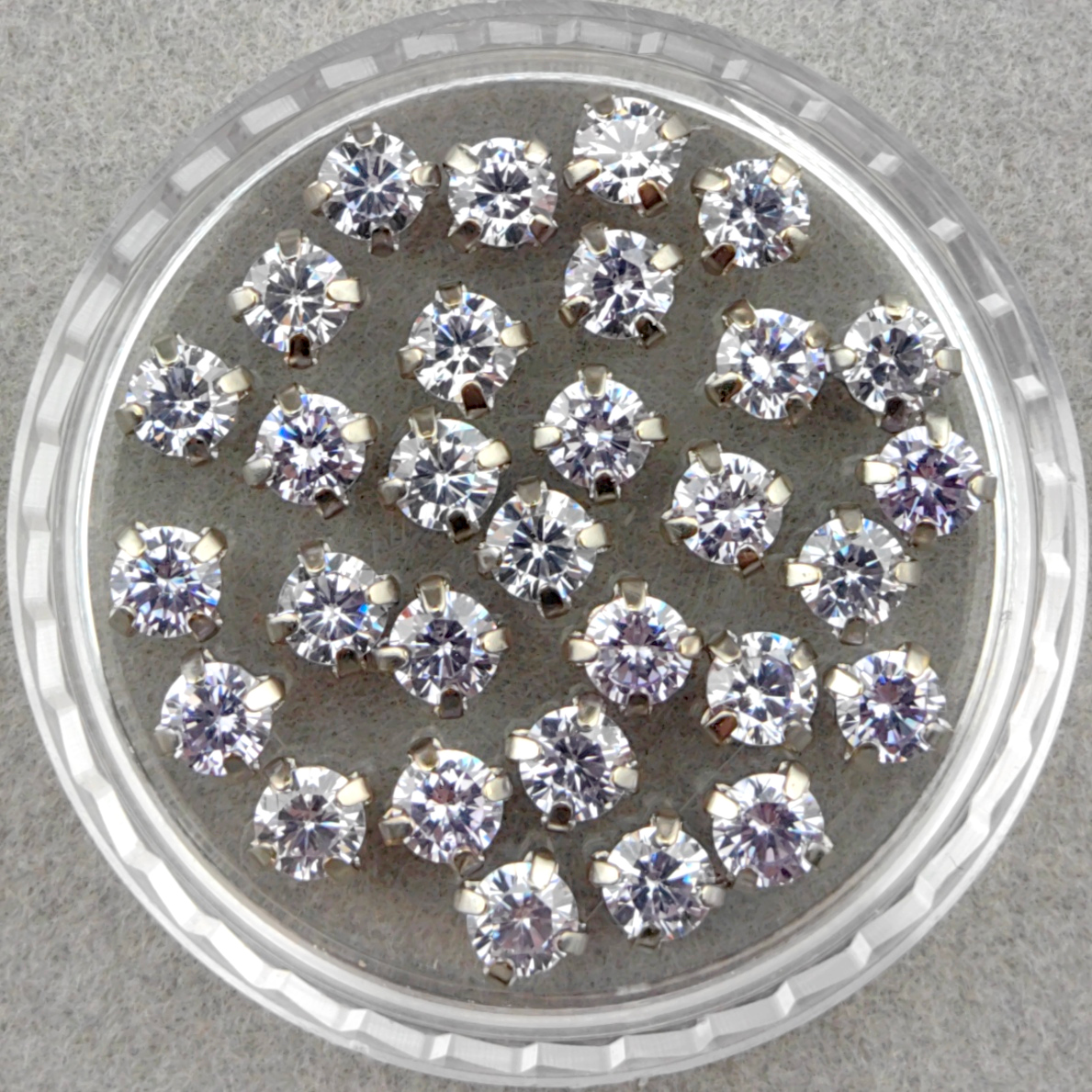 Фианиты круглые в оправах. Внимание: в разных размерах насыщенность этого цвета может немного отличаться (у более крупных камней цвет более выраженный, для фианитов это норма).