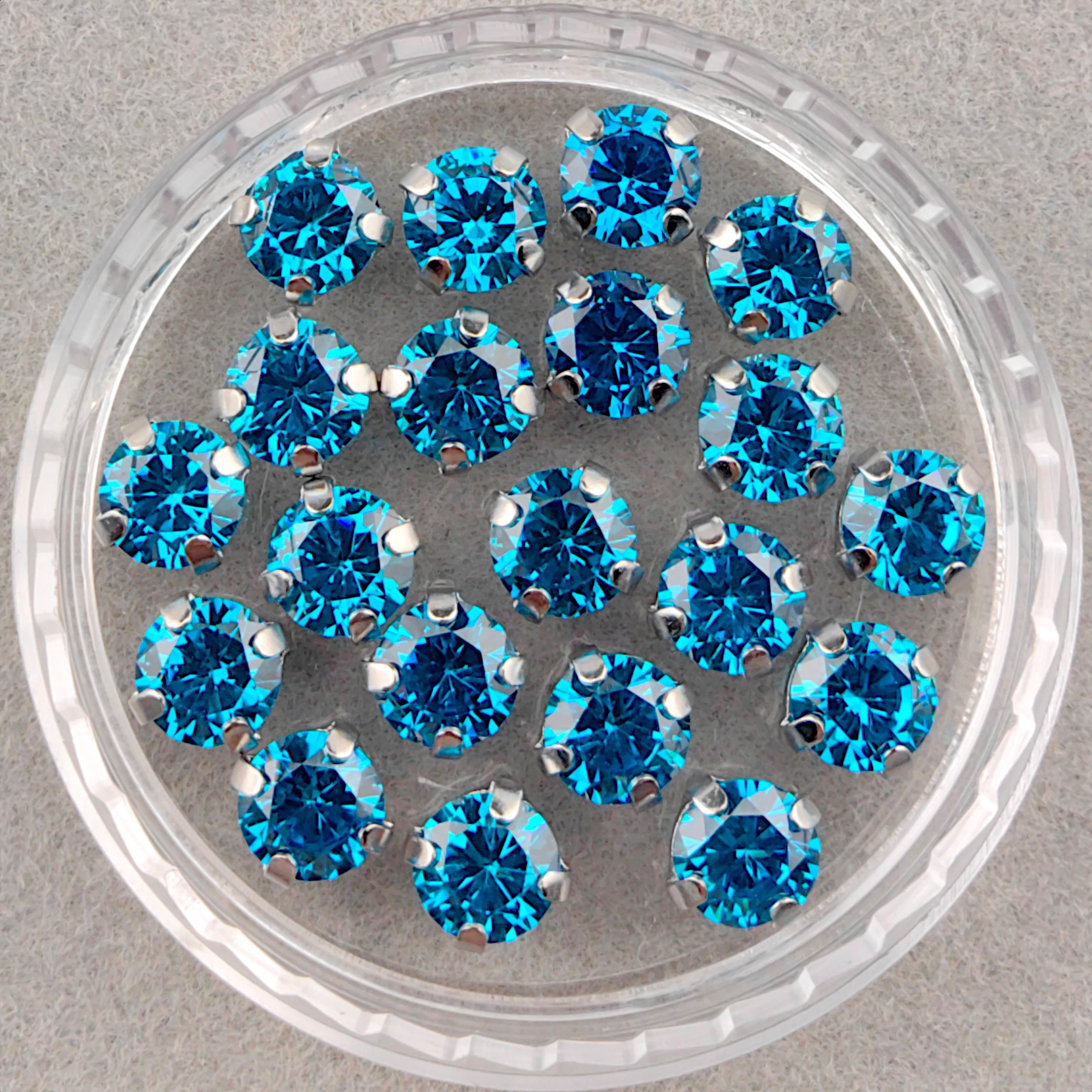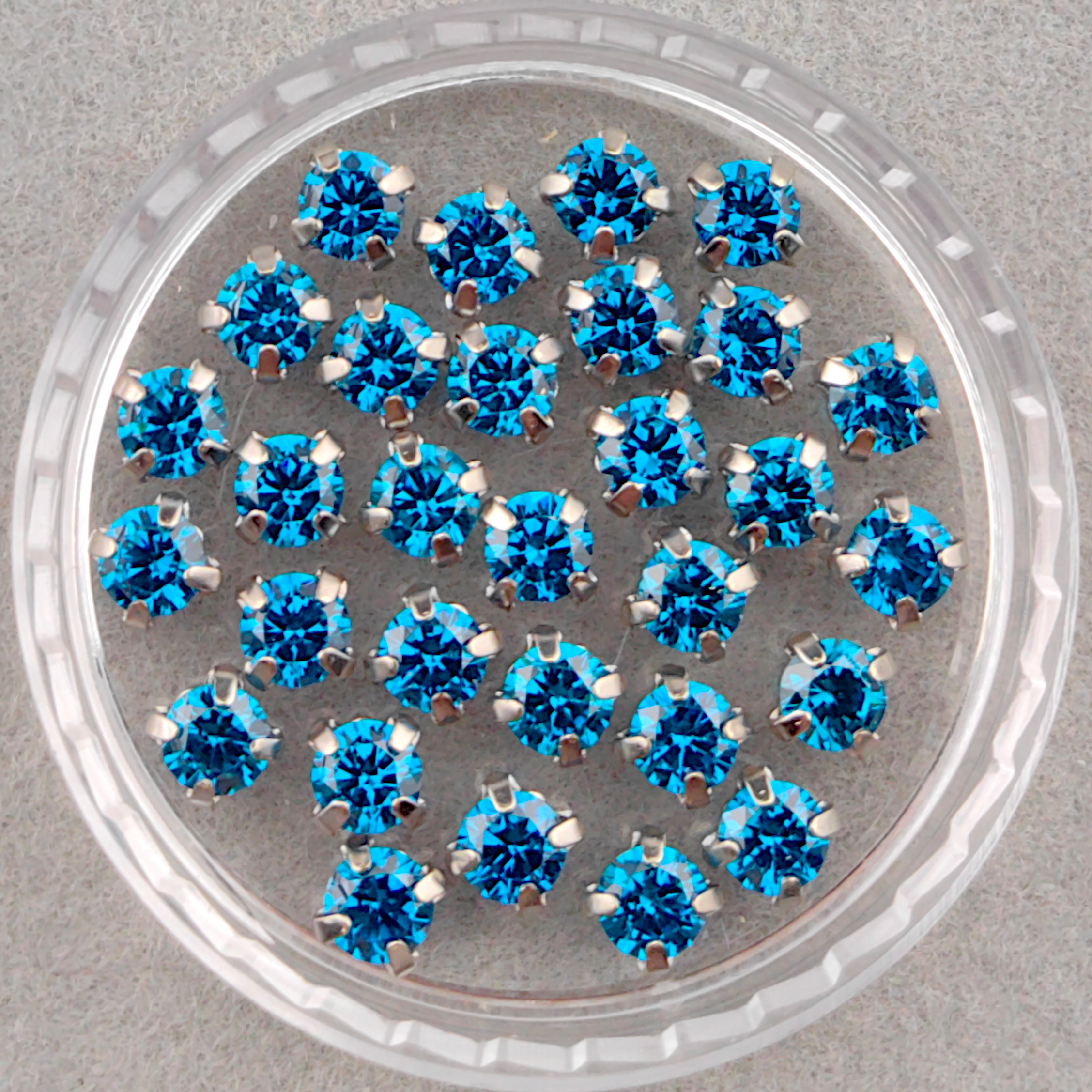Фианиты круглые, лазурные в оправах платинового цвета (Deep Sea Blue/Platinum).