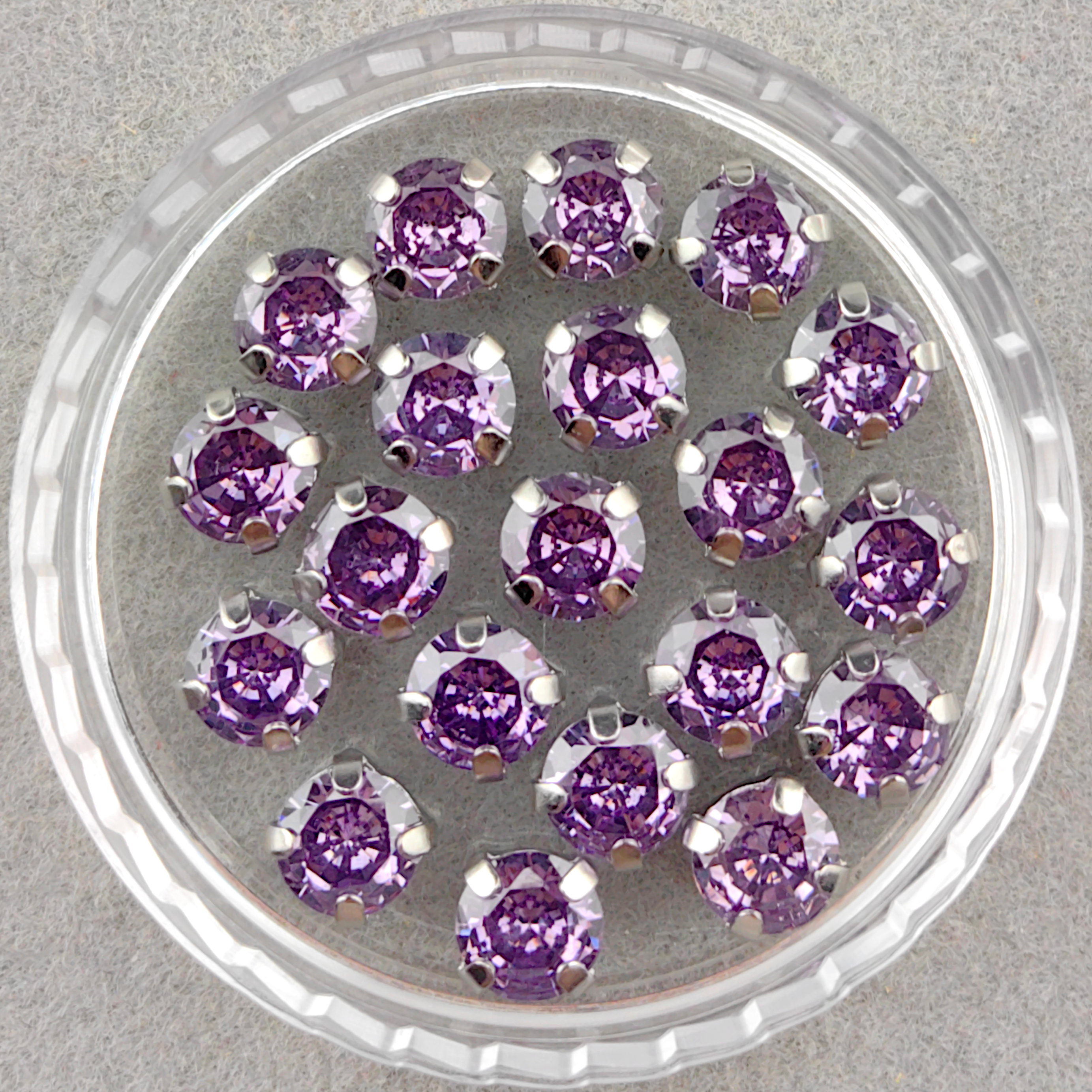Фианиты круглые, лиловые в оправах платинового цвета (Light Amethyst/Platinum).