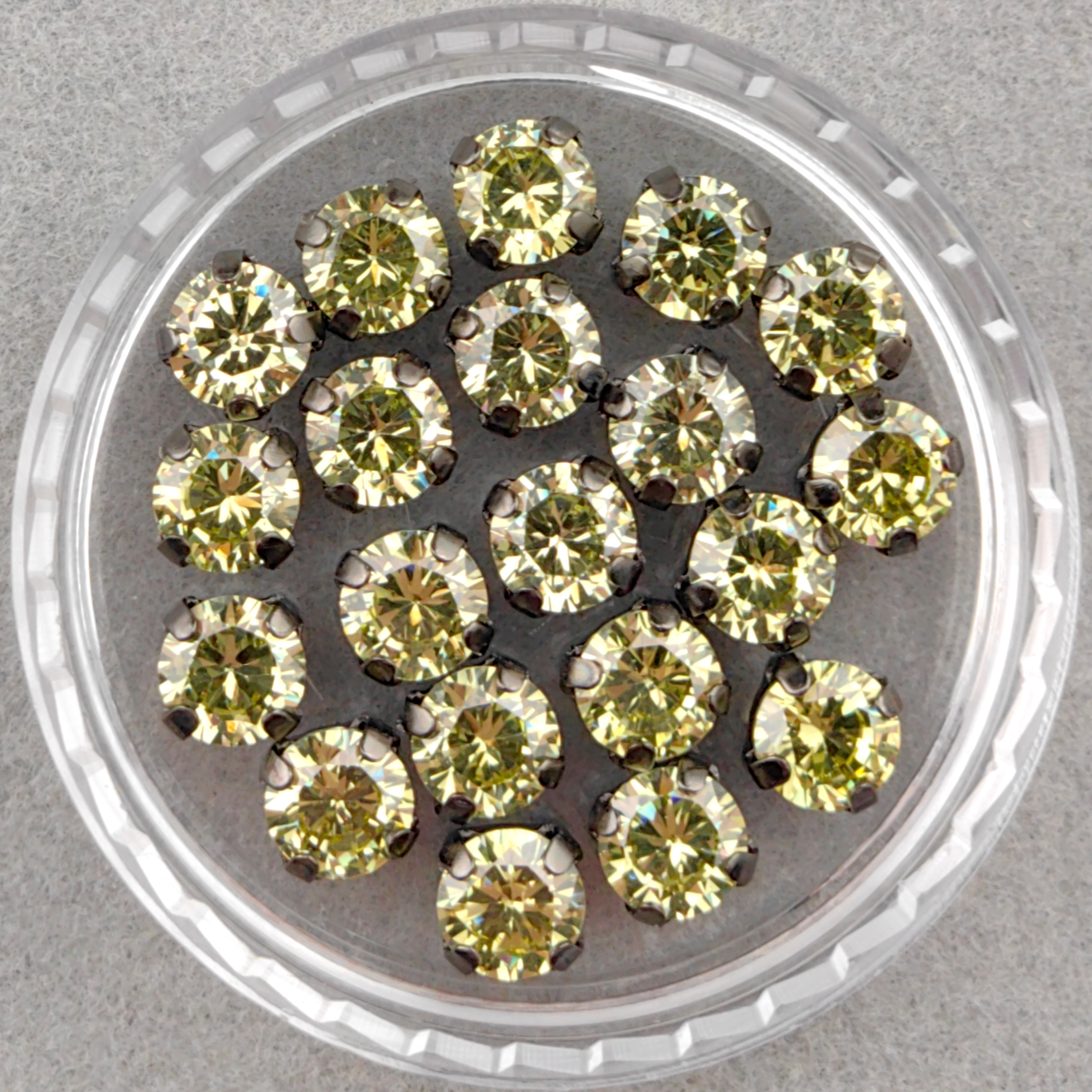 Фианиты круглые, лимонные в оправах цвета темной стали (Olive Yellow/Gunmetal).