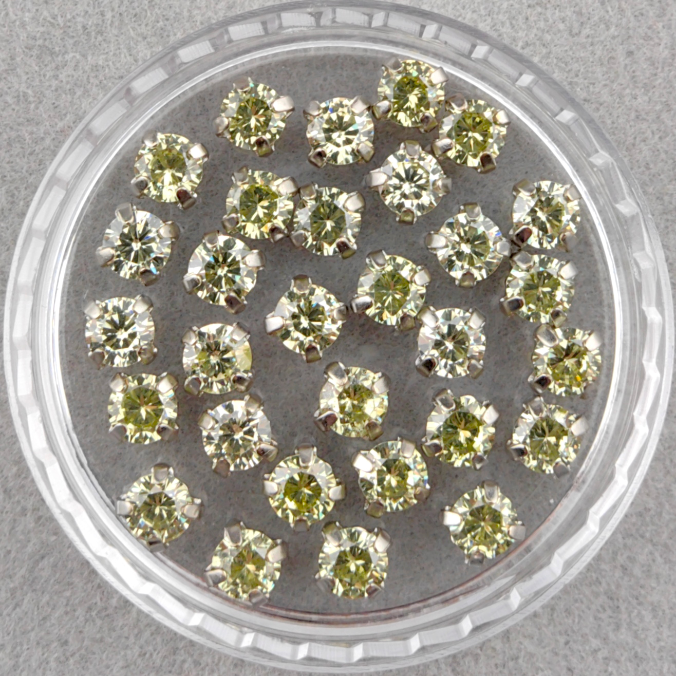 Фианиты круглые в оправах. Внимание: в разных размерах насыщенность этого цвета может немного отличаться (у более крупных камней цвет более выраженный, для фианитов это норма).
