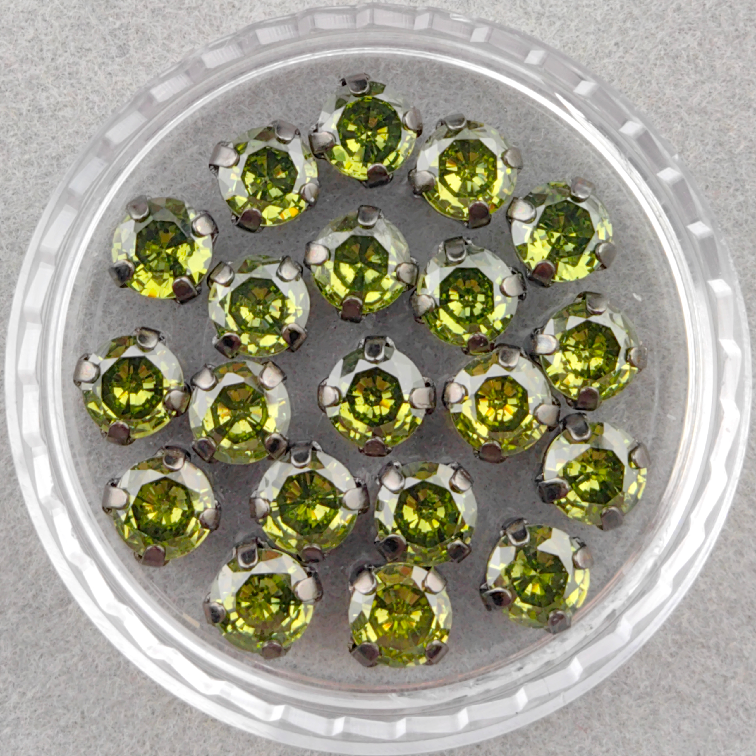 Фианиты круглые, оливковые в оправах цвета темной стали (Light Olive Green/Gunmetal).