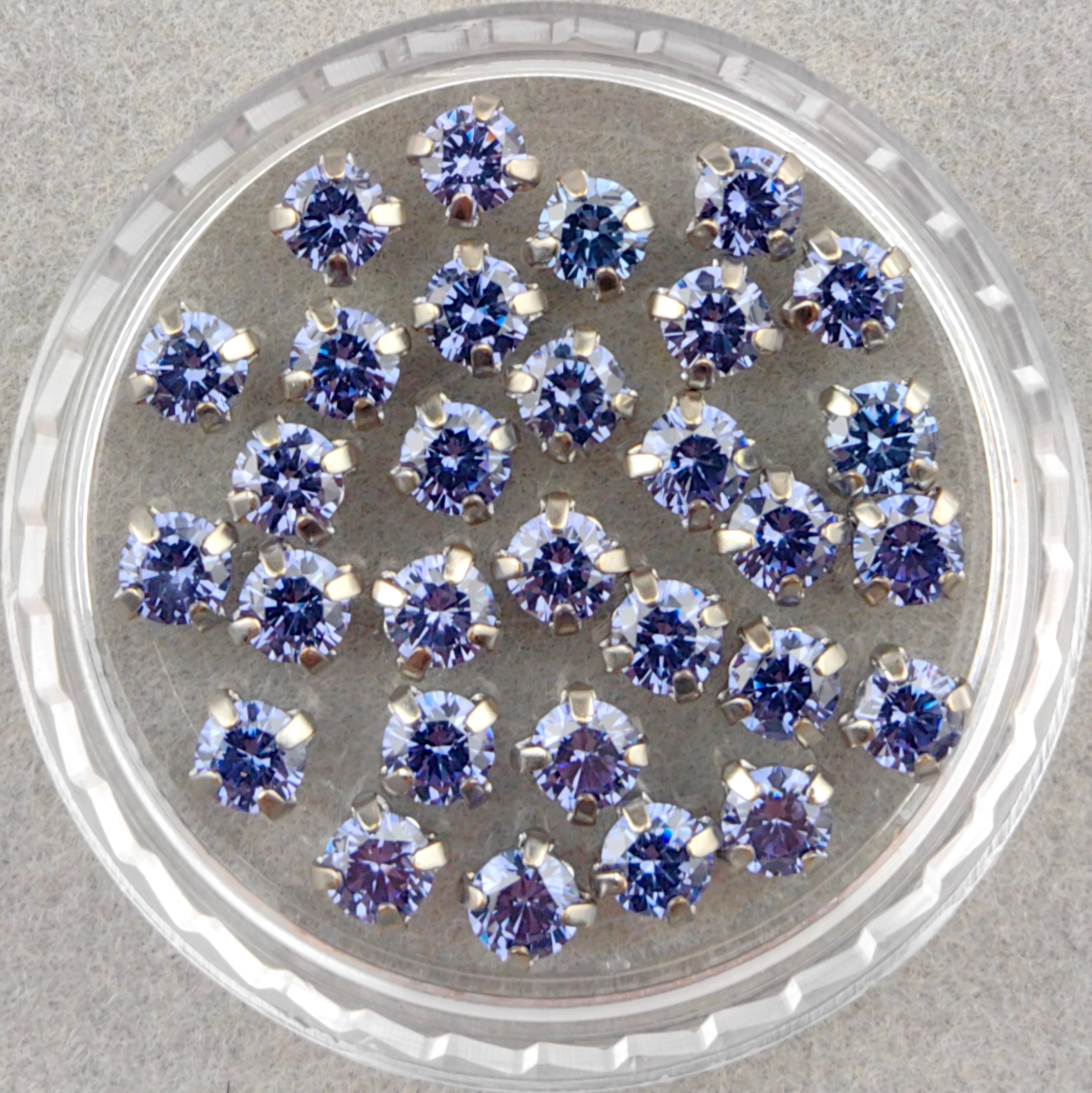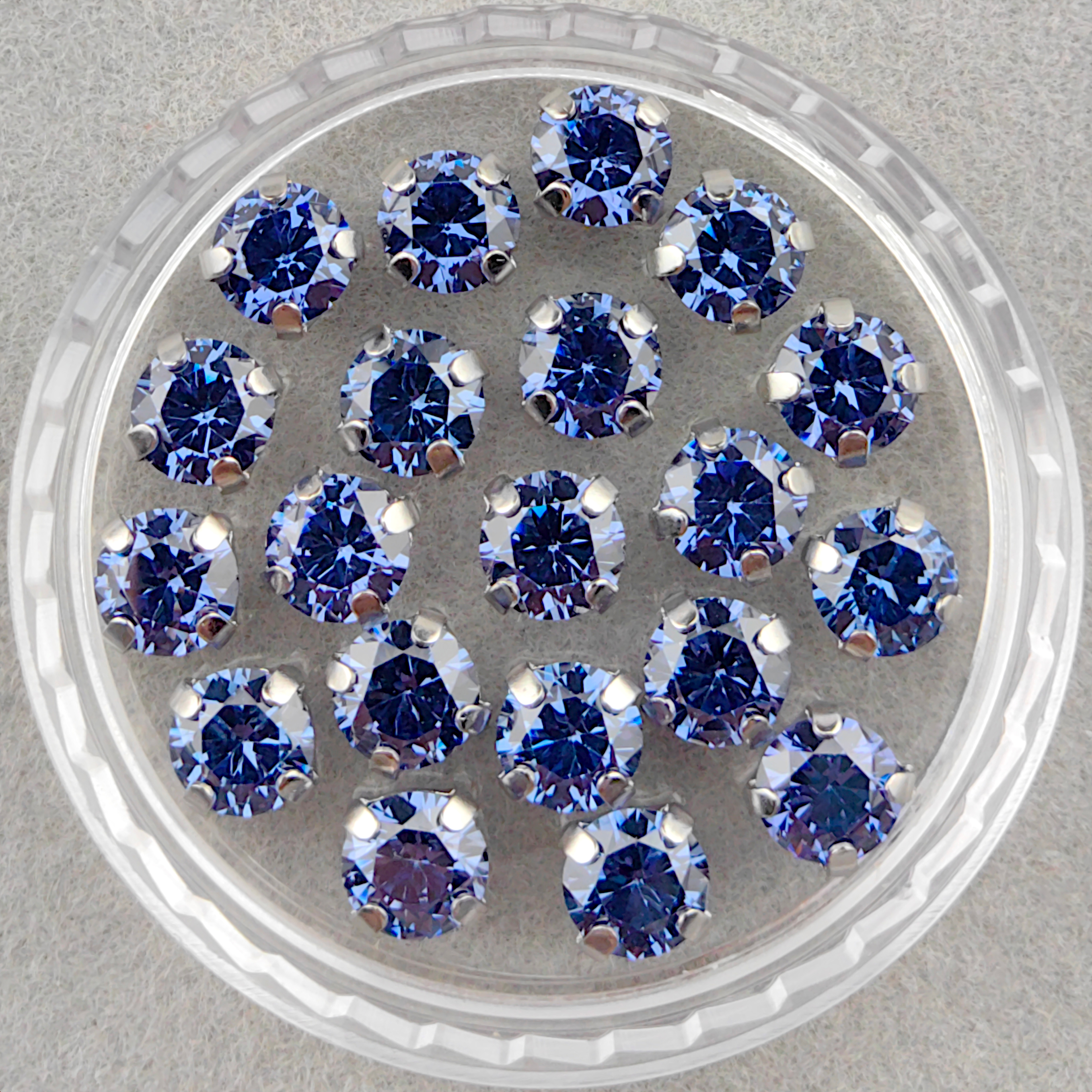 Фианиты круглые, танзанитовые в оправах платинового цвета (Tanzanite/Platinum).